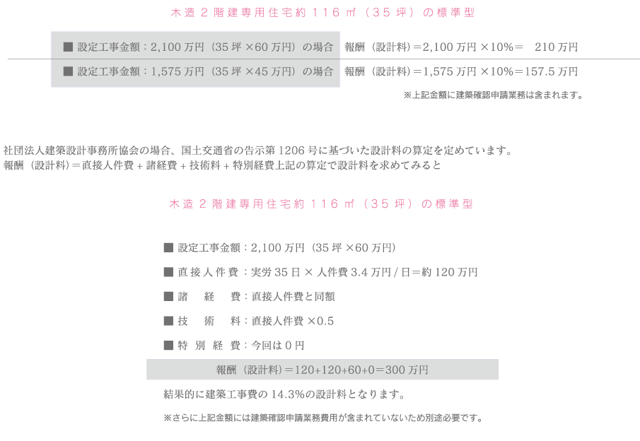 上記左の例では、同じ規模の建物でありながら設計料は変わります。建設会社が違えば同規模・同仕様の建物でも施工金額は変わってきます。屋根材・外装材・内装材に高価なものを使うだけで設計料はアップするのです。